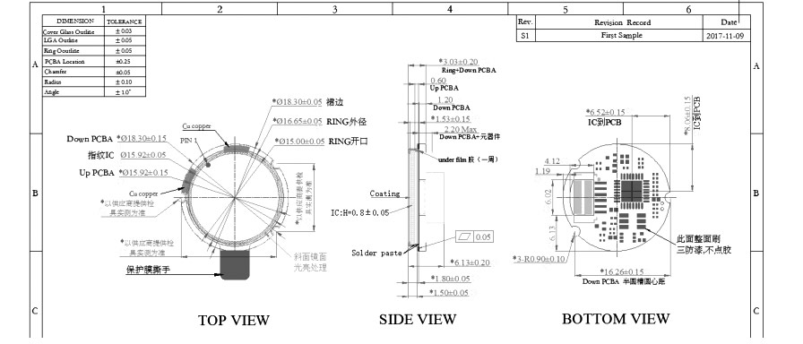 1 1 ) ?圓形模組的固定是通過三個(gè) m R=0.7mm ?的 半圓孔來固定, , 定位柱半徑應(yīng)<0.7mm ,B PCB ?上以半圓孔為同心圓,m R=1.2mm ?為半徑的區(qū)域內(nèi)為元器件避空區(qū)域,請(qǐng)利用此區(qū)域定位 ;