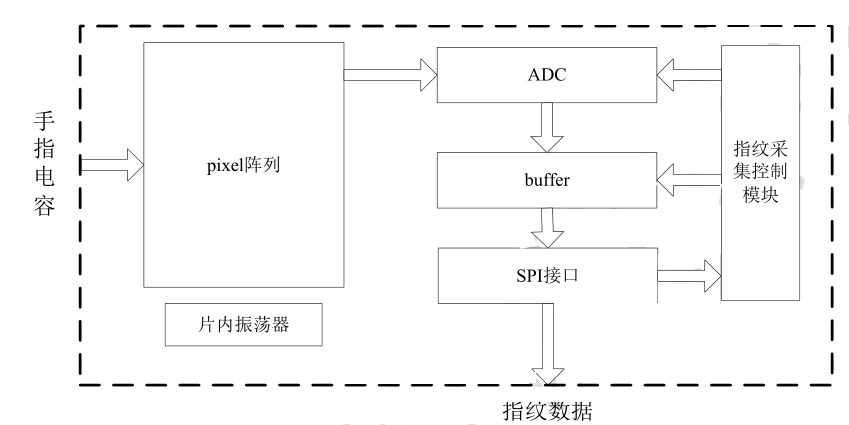 指紋采集控制模塊通過 SPI 接口對其進行配置。指紋采集控制模塊控制模擬前端 ADC 采樣時序;指紋采集控制模塊控制指紋采樣數據的存儲與讀取。