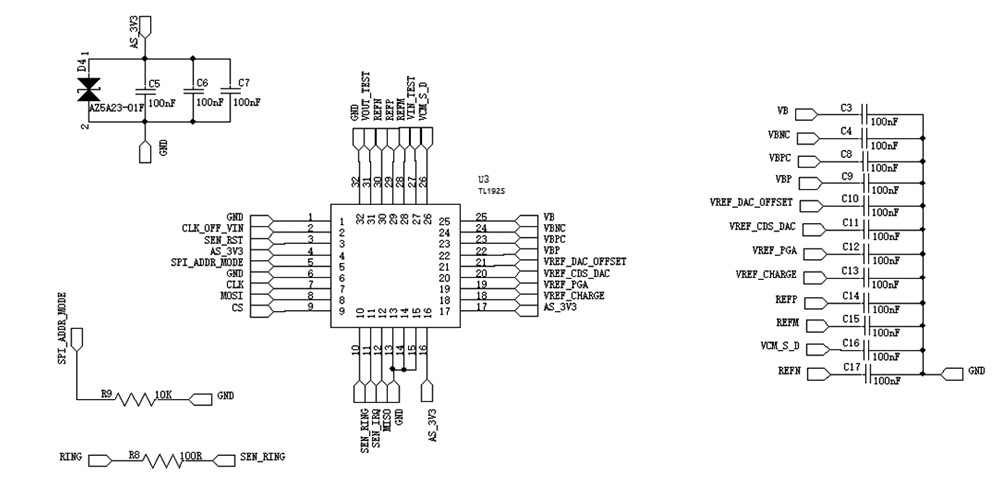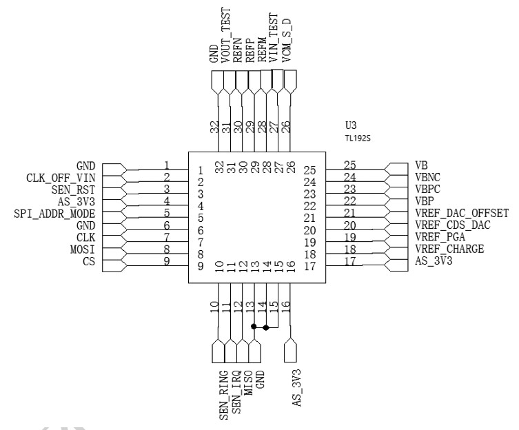 圖 1 所示為 TL192S 電容式指紋傳感器功能框圖,通過 SPI 接口向TL192S 發起指紋采集命令后,pixel 陣列采集的手指電容,通過 ADC 采樣量化,并存入到內部 buffer 中,用戶可以通過中斷或查詢方式從 SPI 接口讀取存儲在內部 buffer 中的指紋數據。ADC 采樣量化和存儲、讀取均在指紋采集控制模塊控制下完成。