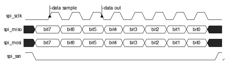 TL192S 內包含了一個 SPI 從機接口。用戶通過 SPI 接口完成對 TL192S的初始化、發出采圖命令、讀取指紋數據。TL192S 僅支持 11 模式,SPI_CLK 上升沿采樣數據,SPI_CLK 下降沿驅動數據,接口時序如下圖所示: